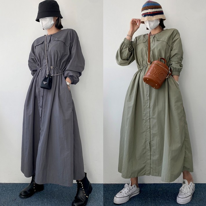 엘샾 캐주얼 아노락 노카라 허리스트링 긴팔 롱 원피스 소매밴딩 플레어라인 가을 원피스