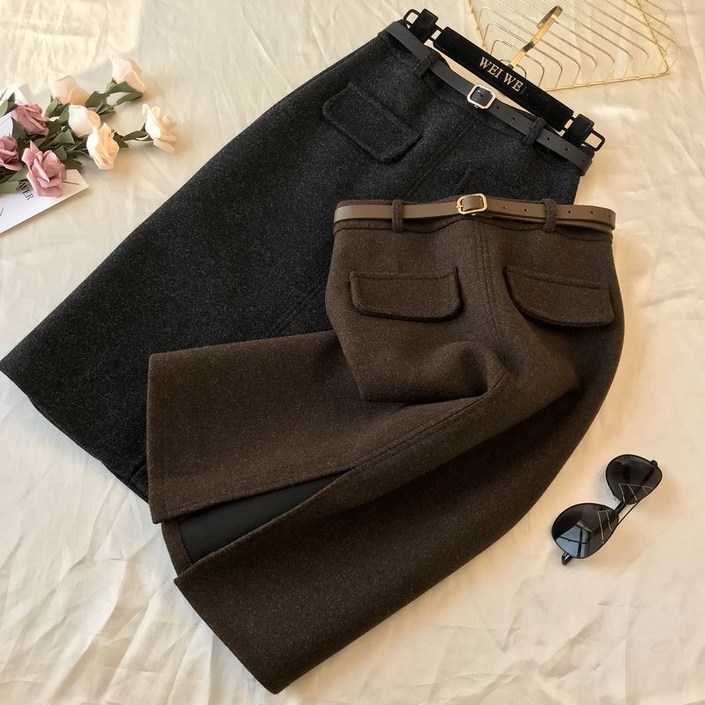 여성 모직 트임 스커트 벨트 치마