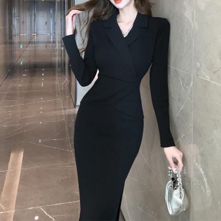 AURALA 여성 정장 원피스 가을 빅사이즈 브이넥 조임 더블 오피스 미디스커트 L092305