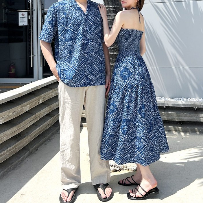 여리진 여성용 여름 페이즐리 홀터넥 원피스 카라 반팔셔츠 커플룩 바캉스룩 시밀러 롱원피스 남녀개별구매 신혼여행 룩