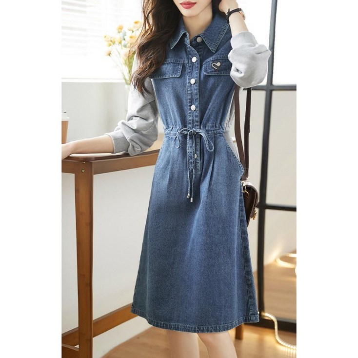 POMTOR 여성 오버핏 데님 원피스 긴팔 자수 디테일 조임끈 허리라인 루즈핏 청원피스