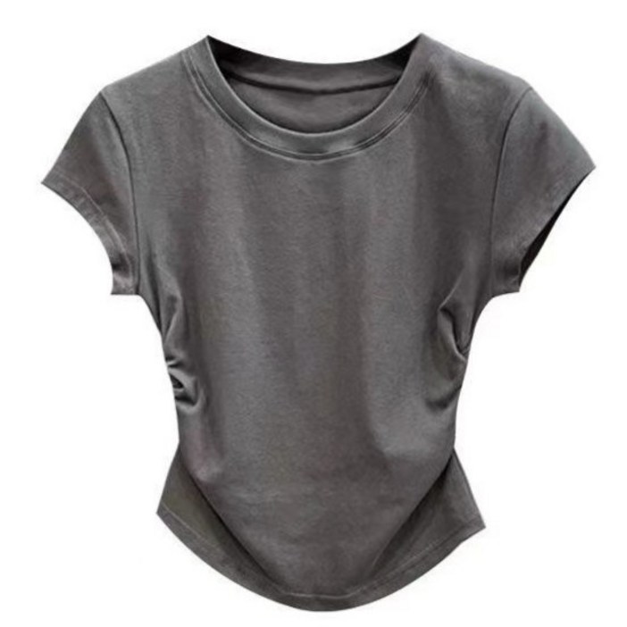 야오야오 밑단굴림 셔링 슬림핏 크롭 반팔 티셔츠