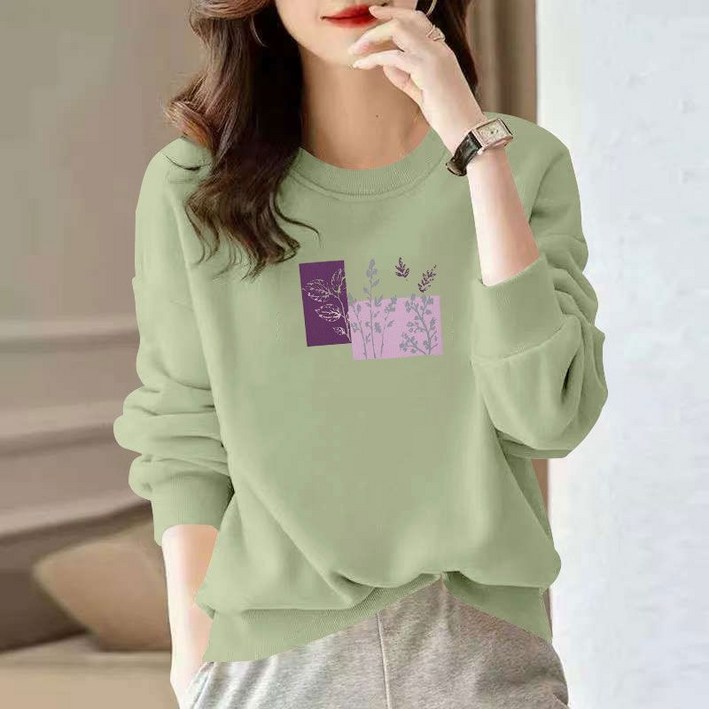 Makone 여성 라운드넥 순면 긴팔 티셔츠 플라워 프린트 패션 캐주얼 데일리 맨투맨