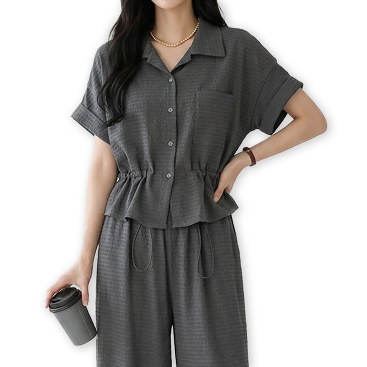 메리앤유 소프트 엠보 패턴 카라 반팔 셔츠 와이드 팬츠 2종 세트 셋업
