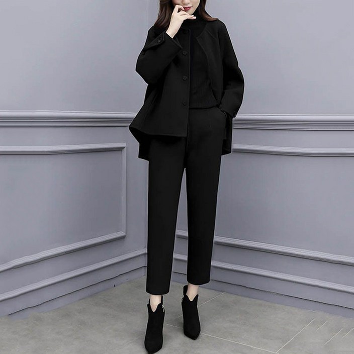여성 가을 겨울 모직 긴팔 톱 9부 팬츠 투피스 캐주얼 패션 세트 슬림소녀