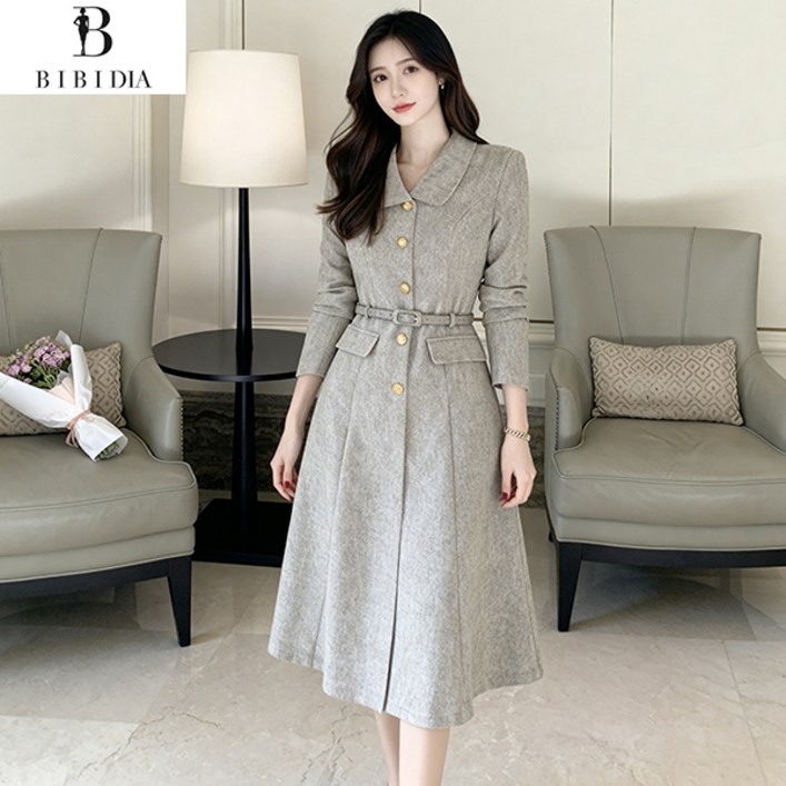 비비디아 여성 봄 가을 클래식 카라넥 금장버튼 플레어핏 하객룩 오피스룩 원피스 데일리룩벨트포함5573