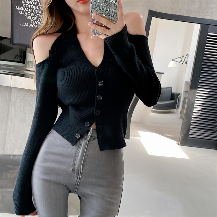 cammello 홀터넥 오프숄더 긴팔 니트 크롭티 어깨트임 단추니트