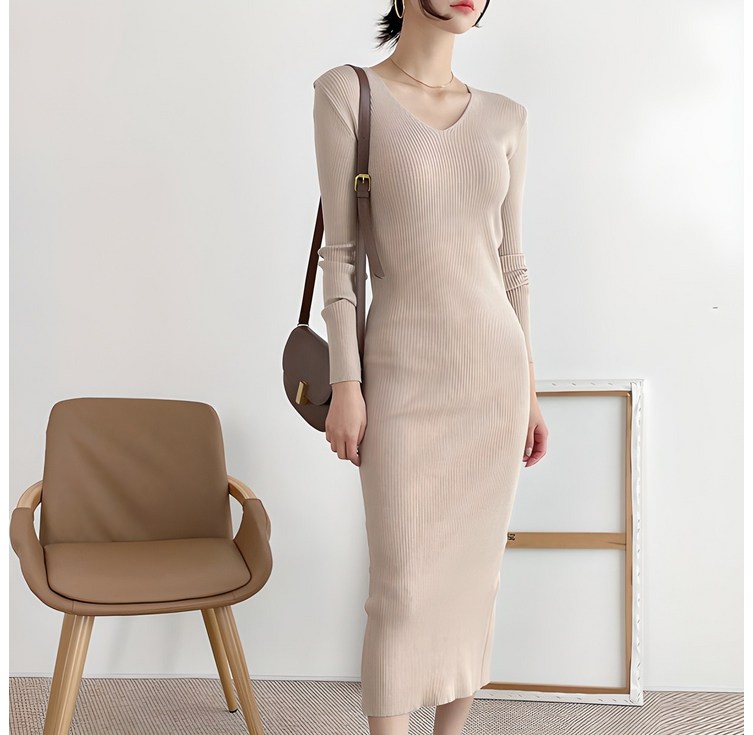 뜨개진 여성용 쫀쫀 뒷트임 브이 골지 쉐일리 롱 원피스