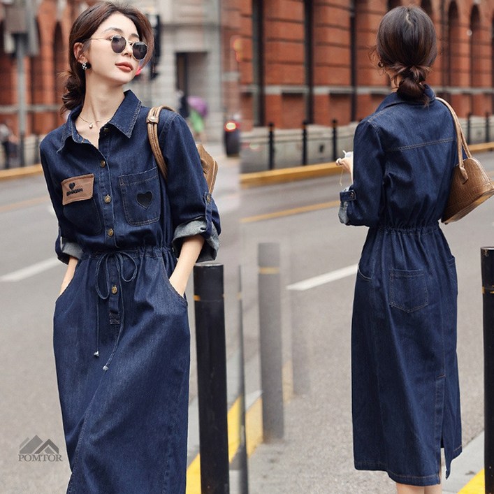 POMTOR 여성 춘추 루즈핏 데님 롱 원피스 가을 청 원피스