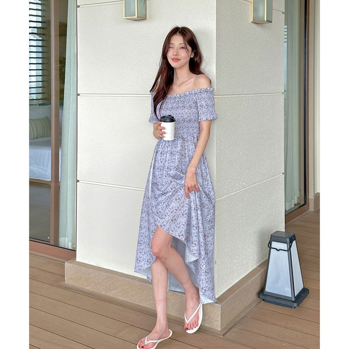 휴양지템MXL 여름 비치원피스 롱 오프숄더 반소매 반팔 스모크 맥시 휴양지룩 바캉스 비치웨어 빅사이즈