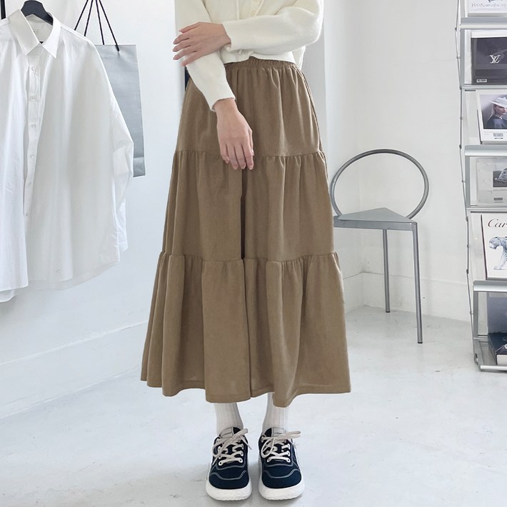 잘빠진 여성용 토피 캉캉 코듀로이 밴딩 롱 스커트