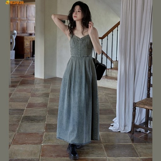 ASURE 여성 여름 데님 원피스 패션 A라인 스커트 빈티지 민소매 롱스커트