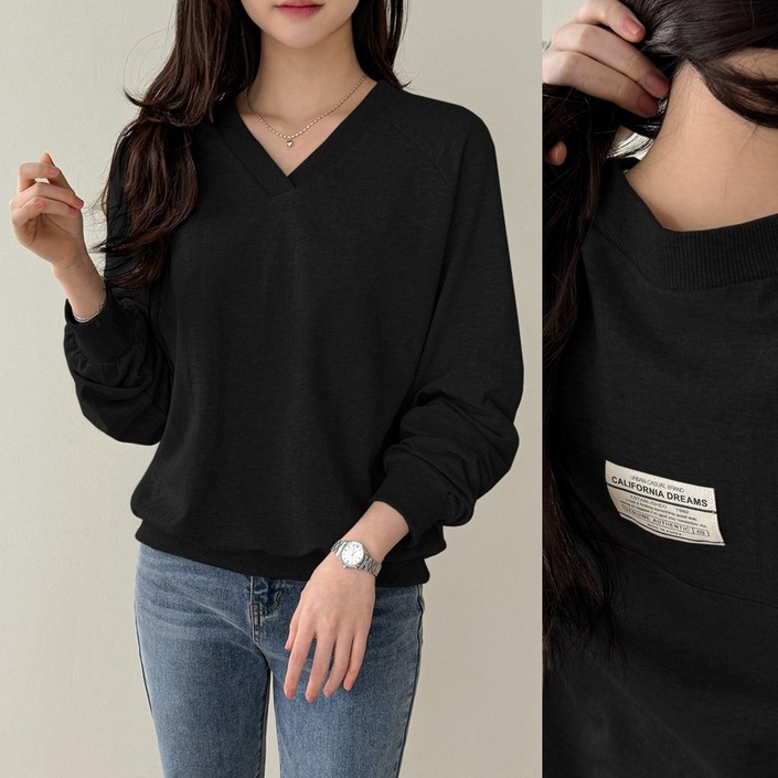 데일리앤 하인트 여성 루즈핏 나그랑 라벨 패치 브이넥 긴팔 쭈리 맨투맨 티셔츠 봄 가을 간절기