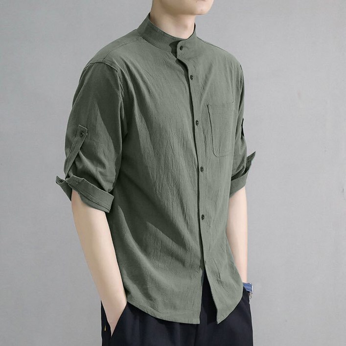 POMTOR 남성 여름 면 린넨 포켓 롤업 셔츠 남방 하이넥 슬림 루즈핏 셔츠