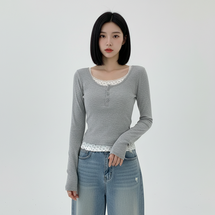 마켓피아 여성용 골지 U넥 레이어드 버튼 긴팔 티셔츠