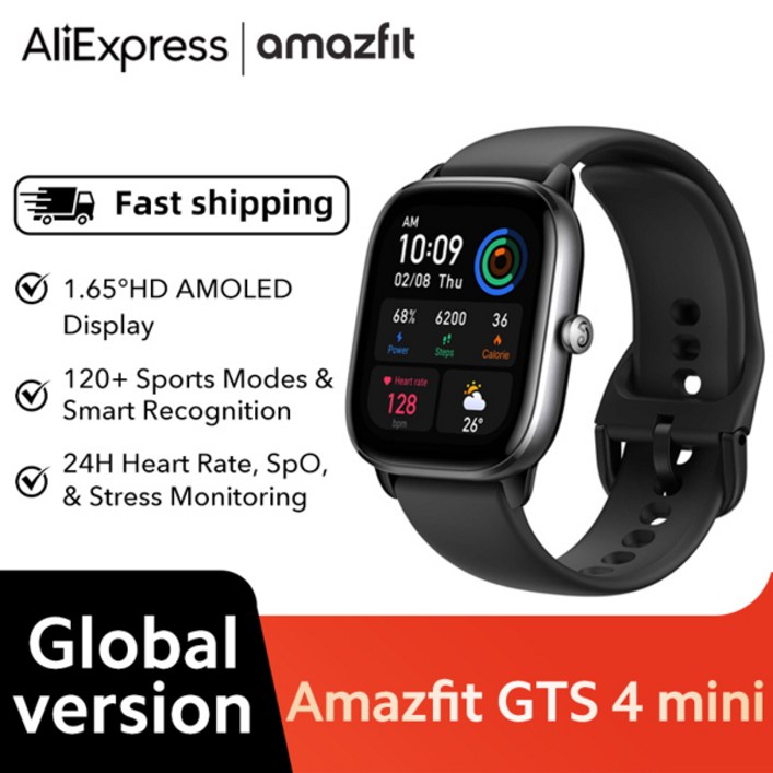 호환 글로벌 버전 아마즈핏 GTS 4 미니 1.65인치 울트라 HD AMOLED 디스플레이 알렉사 내장 24시간 심박수 측정 120가지 스포츠 모드 스마트워치
